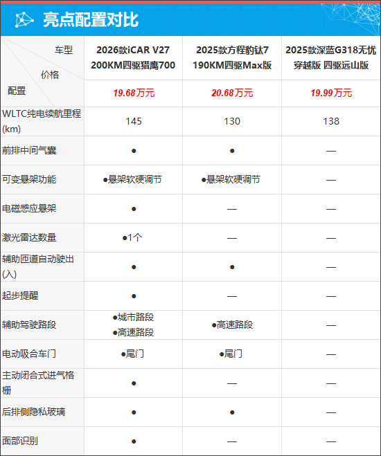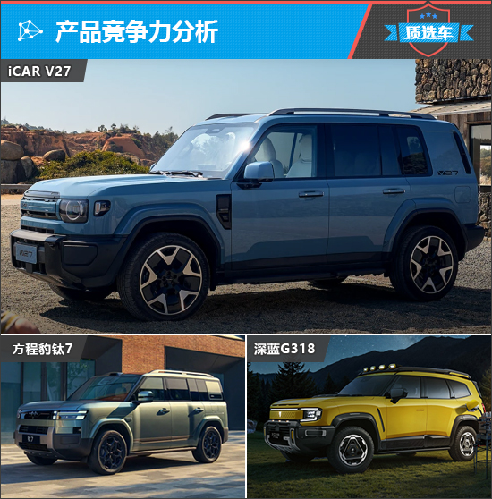 纵观国内新能源SUV市场,消费者可选车型越来越多,市场竞争也变得非常激烈。综合车辆定价、产品定位、市场口碑等多方面因素,此次与2026款iCAR V27(以下简称:iCAR V27)进行对比的车型是2025款方程豹钛7(以下简称:方程豹钛7)和2025款深蓝G318(以下简称:深蓝G318)。