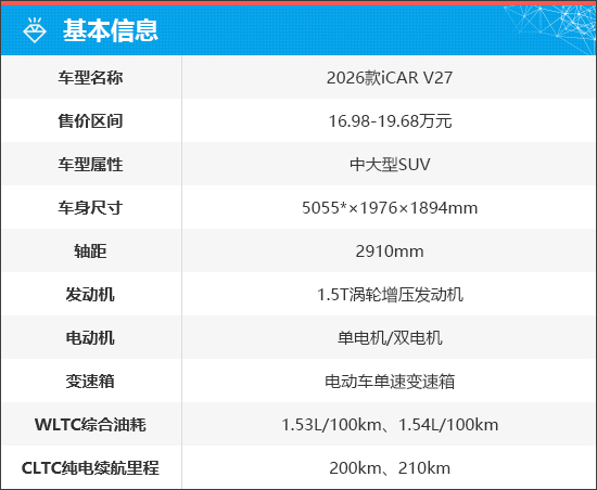 综合来看,iCAR V27不仅拥有不俗的产品力,官方定价也十分务实。作为一款增程式SUV,iCAR V27既能提供纯电车型的经济性,又能兼顾燃油车型的补能便利性;凭借双电机的加持,更具备亮眼的动力表现。此外,高阶驾驶辅助系统的搭载,也让日常用车便利性得到全面提升。兼具高颜值与高性价比的iCAR V27,有望在未来跻身所在细分市场热销车型阵营。