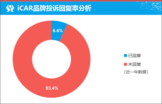 在衡量新车售后服务口碑方面,我们将通过企业对于车主投诉的回复情况进行分析,相对客观地对于新车未来的售后服务口碑有所预判。据车质网数据显示,近一年iCAR品牌投诉回复率为6.6%,可见厂家对于车主的诉求重视程度亟待提升。