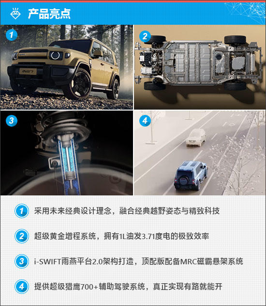 动态性能方面,依托i-SWIFT雨燕平台2.0架构,新车拥有同级领先的轻量化车身,采用四轮四角布局,顶配车型配备MRC磁霸悬架系统,让大车也有灵活的操控性。此外,新车还提供8+X全路况驾驶模式和i-AWD鬣蜥四驱系统。通过性方面,新车拥有220mm的离地间隙和600mm的整车最大涉水深度。